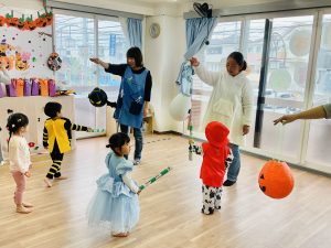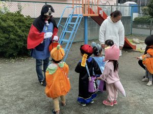 10月31日、みんなそれぞれ可愛い衣装に身を包み、お外を歩いてお菓子をもらいに行きました。