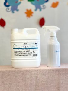 〇次亜塩素酸水(プロトクリンアクア)による、手指、玩具、入り口ゲート、ドアノブなどの、消毒を行っています。