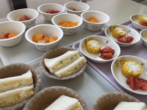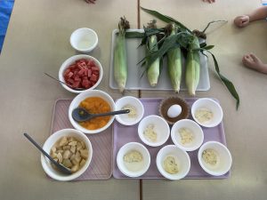 とうもろこしの皮むきや、サンドイッチの具材のたまごとタルタルソースを混ぜたり、好きなフルーツを選んでフルーツポンチを作ったりしました。